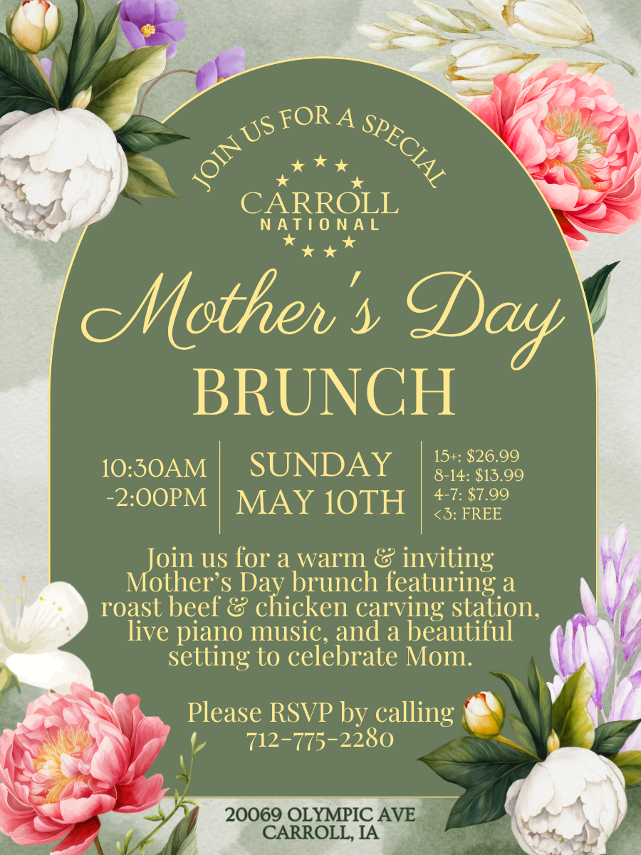 Events Calendar Carroll National Golf Club > « All Events MOTHER’S DAY BRUNCH May 10 @ 10:30 am - 2:00 pm « KUEMPER BOYS INVITATIONAL MEN’S SUPPER LEAGUE » Add to calendar Google Calendar iCalendar Outlook 365 Outlook Live Details Date: May 10 Time: 10:30 am - 2:00 pm