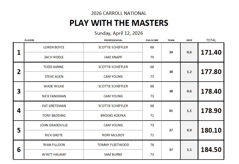 Events Calendar Carroll National Golf Club > « All Events This event has passed. “PLAY WITH THE MASTERS” RESULTS & PHOTOS April 12 @ 11:00 am - 5:00 pm « 76ers GAME WATCH & HAPPY HOUR MEN’S SUPPER LEAGUE » CHAMPIONS Loren Boyce & Zach Riddle Add to calendar Google Calendar iCalendar Outlook 365 Outlook Live Details Date: April 12 Time: 11:00 am - 5:00 pm